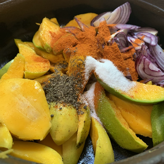 In a separate bowl add the cut mango, turmeric, chillie powder, black pepper, sugar, paprika, chilli, salt and mix all together.